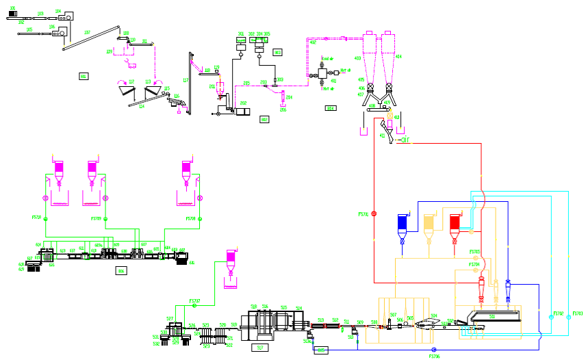 創(chuàng )新設計的電控系統為全電腦參數控制形式。采用現場(chǎng)通訊總線(xiàn)結構,可通過(guò)軟件對生產(chǎn)過(guò)程的工藝參數和運行狀態(tài)故障情況進(jìn)行設定、操作、監控和記錄;控制電腦冗余設計,在電腦上進(jìn)行所有的生產(chǎn)操作,較以往簡(jiǎn)單電腦監控的方式在控制技術(shù)水平上以及可靠性上有了顯著(zhù)提升;大幅增加自動(dòng)閉環(huán)調節回路,減少了人工干預,保證工藝過(guò)程運行穩定,波動(dòng)小。B、 流程圖參考