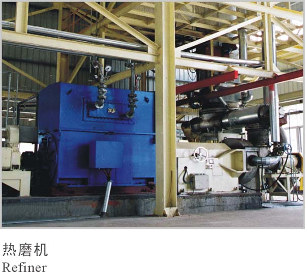 3、調供膠工段 我們采用的是先施膠后干燥工藝。熔融石蠟或其他防水劑直接送入熱磨機,在兩磨盤(pán)的擠壓和揉搓下、石蠟均勻地與纖維混合在一起。膠粘劑在一定壓力下經(jīng)管道輸送到熱磨機纖維噴放管中與纖維進(jìn)行充分混合。